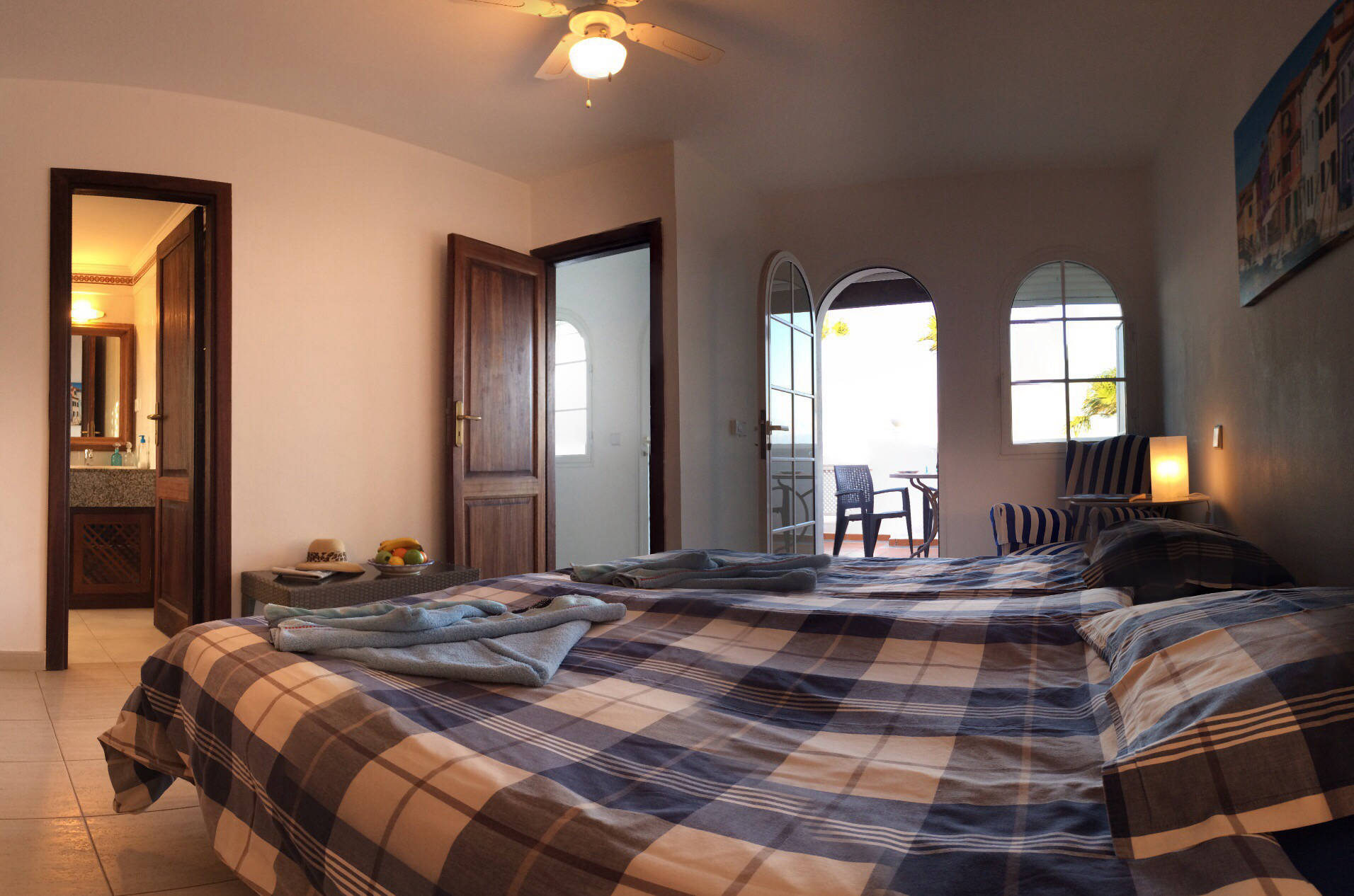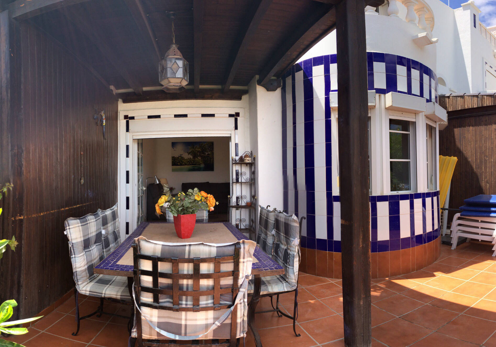 The VILLA DEL MAR is situated directly on the sea front, which offers total privacy with an excellent infrastructure. The combination of Spanish and Moroccan architecture will enchant you immediately. The spacious living area offers plenty of room for your family as well as your guests. The wonderful view from the living room overlooking the sea will put you in a relaxed mood immediately. In the fully equipped kitchen (which includes an CERAN-oven, hob, refrigerator, freezer, dishwasher, etc.) meals can be prepared at ease. Not only the living room but also the three ample en-suite bedrooms are exclusively furnished. Enjoy dining with a stunning sea view from the round table in a Spanish style oriel. The secluded and spacious terrace and garden surrounded by tropical plants invites for unimpaired sun-bathing.